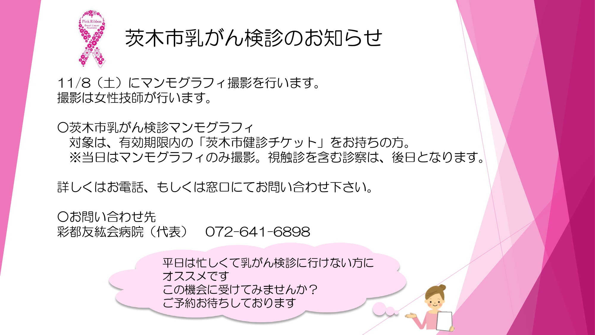 11/8(土)茨木市乳がん検診のお知らせ(女性技師による撮影です)